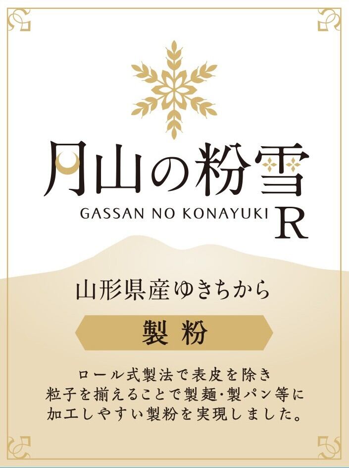 山形県鶴岡市の月山高原農地委員会で耕作放棄地を解消と農地保全を目的に、生産管理された小麦「ゆきちから」を表皮部分を除くロール挽きで製粉しました。石臼挽きでは出来ない真っ白な小麦粉で、180メッシュの細かい製粉の均一さで製麺、製パン、その他小麦加工品のし易さに特化しました。製粉前、製粉後においても低温倉庫にて完全保管しております。